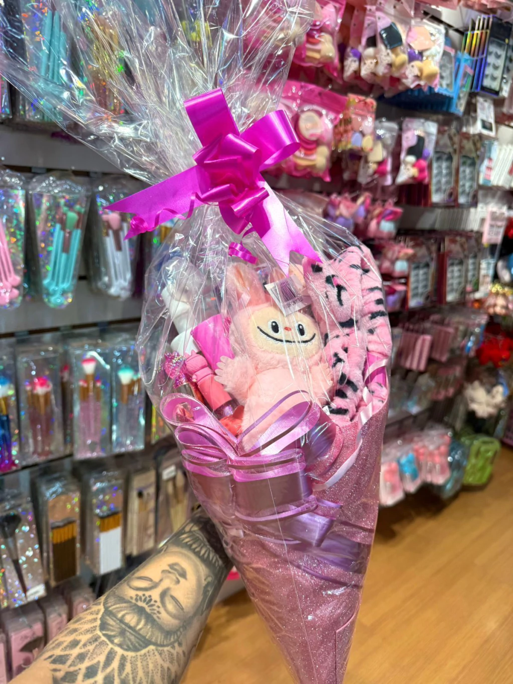 3- kit buque labubu contém 10 ítens -- gloss labial brilhoso, lip oil labial, chaveiro labubu,iluminador, faixa para make, agua micelar, kit de pinceis, batom, blush