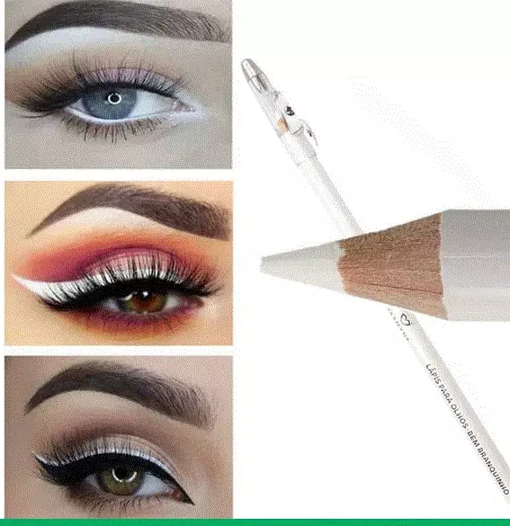 O lápis branco, cria a ilusão de ótica de um olho maior ao neutralizar a linha d'água dando a impressão que ela faz parte, além delineado branco, o deixando super pigmentado um olhar de arrasar com uma durabilidade incrível.