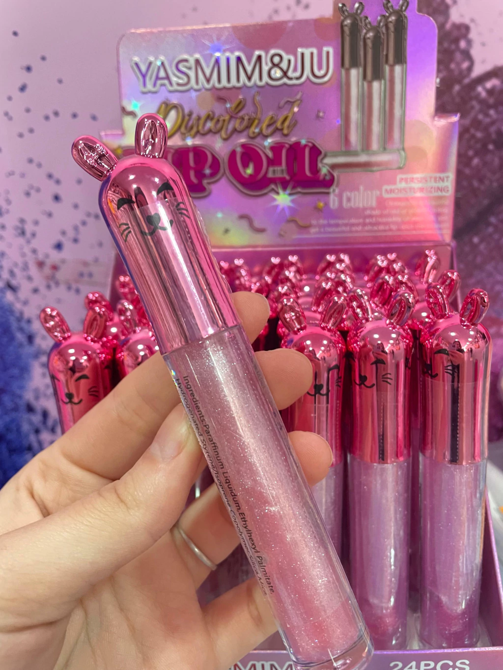 Lip Oil Discolored Yasmim & Ju Brilho mágico e personalizado! ✨💖 Com glitter delicado, o Lip Oil Discolored reage ao pH da boca, mudando de cor e revelando um tom único em cada pessoa, enquanto hidrata e deixa os lábios radiantes.